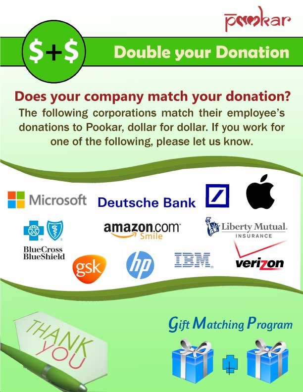Many employers offer donation matching programs, doubling the impact of your gift to Pookar. If you work for a company that matches charitable contributions, your donation could go twice as far!